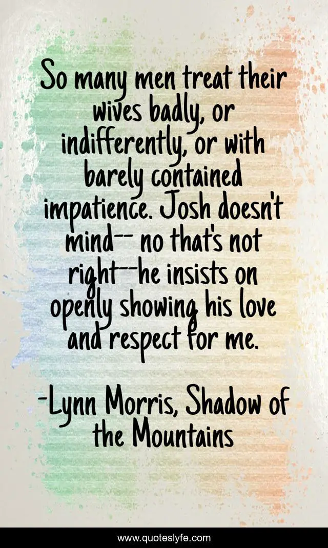 This page presents the quote "So many men treat their wives badly, or indifferently, or with barely contained impatience. Josh doesn't mind-- no that's not right--he insists on openly showing his love and respect for me.". Author of this quote is Lynn Morris, Shadow of the Mountains. This quote is about relationships, love, patience, marriage, respect, indifference, affection,.