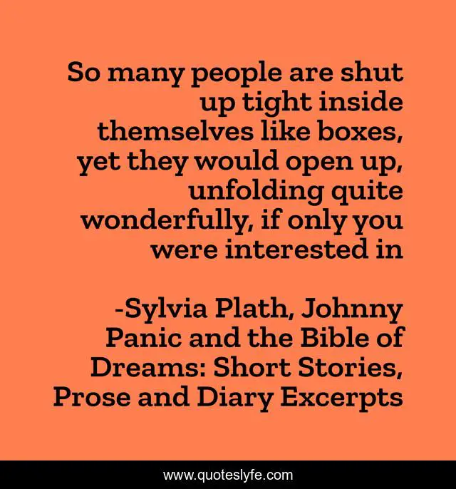 This page presents the quote "So many people are shut up tight inside themselves like boxes, yet they would open up, unfolding quite wonderfully, if only you were interested in". Author of this quote is Sylvia Plath, Johnny Panic and the Bible of Dreams: Short Stories, Prose and Diary Excerpts. This quote is about shyness, confidence, loneliness,.