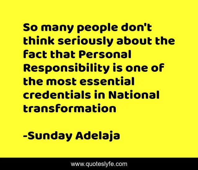 This page presents the quote "So many people don't think seriously about the fact that Personal Responsibility is one of the most essential credentials in National transformation". Author of this quote is Sunday Adelaja. This quote is about people, many, national, essential, most, seriously, responsibility, credentials, transformation,.