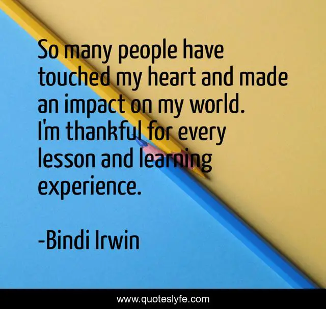 This page presents the quote "So many people have touched my heart and made an impact on my world. I'm thankful for every lesson and learning experience.". Author of this quote is Bindi Irwin. This quote is about thankful, experience, heart,.
