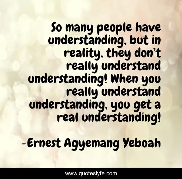 This page presents the quote "So many people have understanding, but in reality, they don’t really understand understanding! When you really understand understanding, you get a real understanding!". Author of this quote is Ernest Agyemang Yeboah. This quote is about life, understanding, understanding-oneself-and-others, puzzles-of-life,.