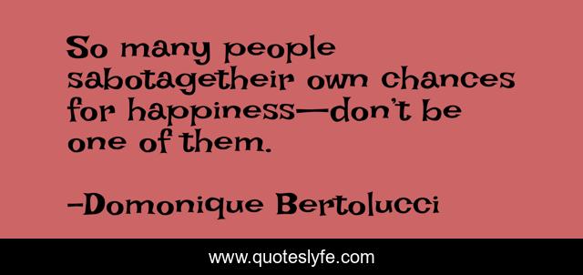 This page presents the quote "So many people sabotagetheir own chances for happiness—don’t be one of them.". Author of this quote is Domonique Bertolucci. This quote is about life-coaching, motivation, how-to-be-happier, life-coach, be-happy, how-to-be-happy, happiness-advice, happiness, be-more-motivated,.