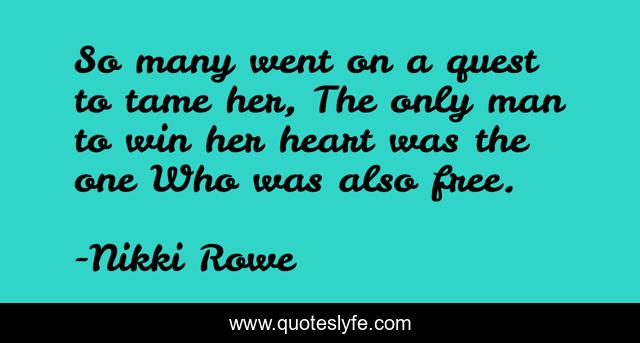 This page presents the quote "So many went on a quest to tame her, The only man to win her heart was the one Who was also free.". Author of this quote is Nikki Rowe. This quote is about true-love, heart, intuition, love, quotes, quote-of-the-day, synchronicity, twin-flames, quotes-about-love,.