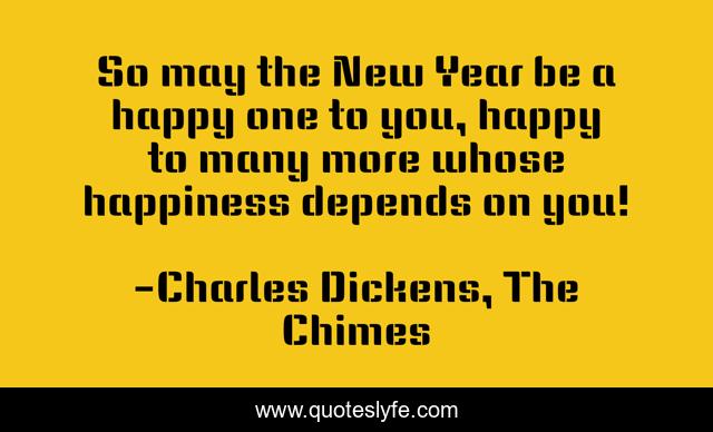 This page presents the quote "So may the New Year be a happy one to you, happy to many more whose happiness depends on you!". Author of this quote is Charles Dickens, The Chimes. This quote is about chimes, wise, enthusiasm, inspirational, year, new, charity,.