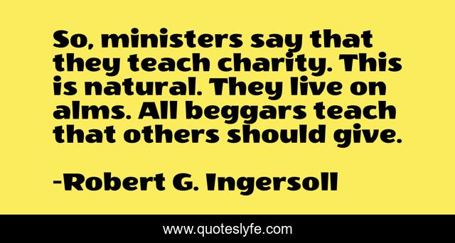 This page presents the quote "So, ministers say that they teach charity. This is natural. They live on alms. All beggars teach that others should give.". Author of this quote is Robert G. Ingersoll. This quote is about religion, charity,.