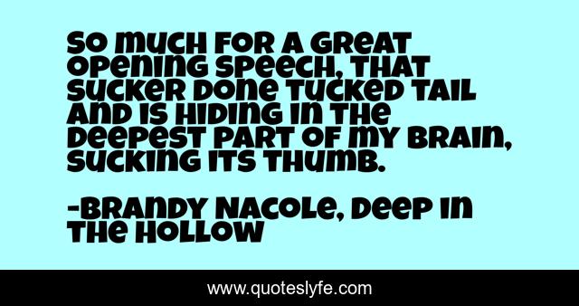 This page presents the quote "So much for a great opening speech, that sucker done tucked tail and is hiding in the deepest part of my brain, sucking its thumb.". Author of this quote is Brandy Nacole, Deep in the Hollow. This quote is about humorous, urban-legend, jo, paranormal, paranormal-thriller,.