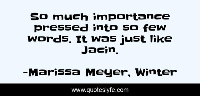 This page presents the quote "So much importance pressed into so few words. It was just like Jacin.". Author of this quote is Marissa Meyer, Winter. This quote is about jacin, winter,.