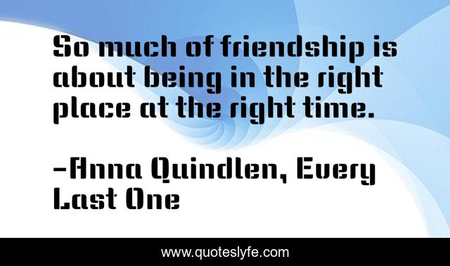 This page presents the quote "So much of friendship is about being in the right place at the right time.". Author of this quote is Anna Quindlen, Every Last One. .