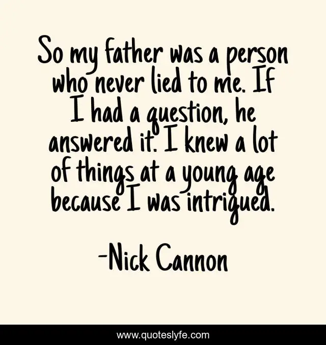 This page presents the quote "So my father was a person who never lied to me. If I had a question, he answered it. I knew a lot of things at a young age because I was intrigued.". Author of this quote is Nick Cannon. This quote is about me, age, father,.