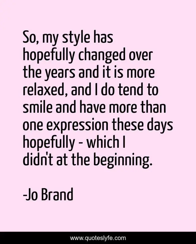 This page presents the quote "So, my style has hopefully changed over the years and it is more relaxed, and I do tend to smile and have more than one expression these days hopefully - which I didn't at the beginning.". Author of this quote is Jo Brand. This quote is about style, beginning, years,.