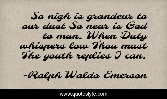 This page presents the quote "So nigh is grandeur to our dust So near is God to man. When Duty whispers low Thou must The youth replies I can.". Author of this quote is Ralph Waldo Emerson. .