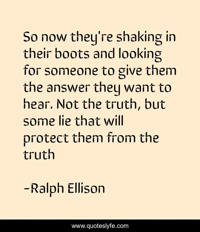This page presents the quote "So now they're shaking in their boots and looking for someone to give them the answer they want to hear. Not the truth, but some lie that will protect them from the truth". Author of this quote is Ralph Ellison. This quote is about lie, juneteenth, truth,.