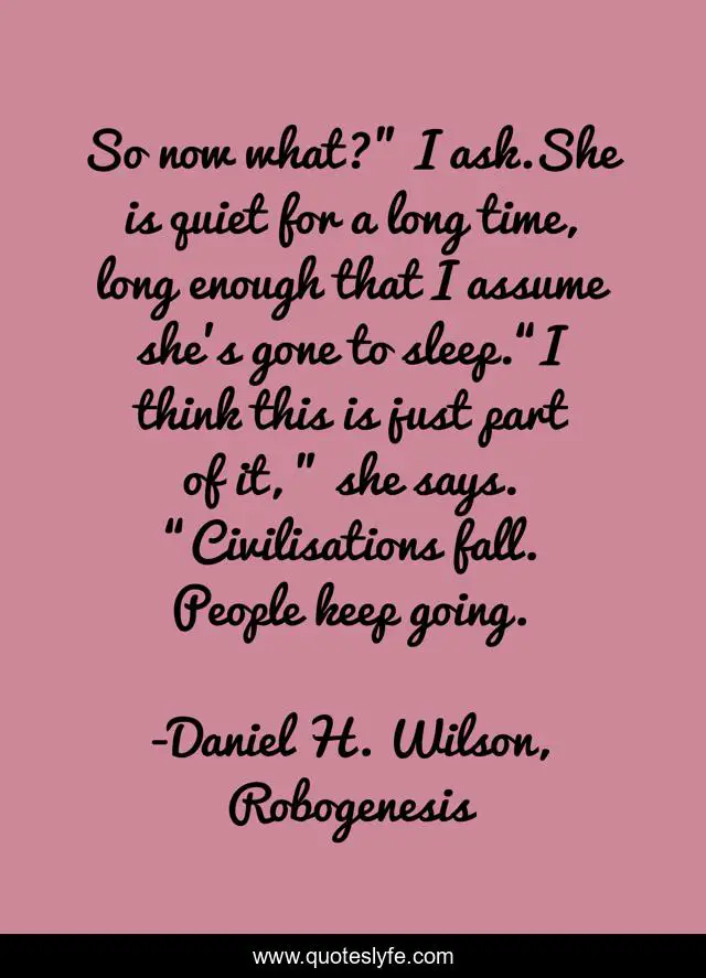This page presents the quote "So now what?” I ask.She is quiet for a long time, long enough that I assume she’s gone to sleep.“I think this is just part of it, ” she says. “Civilisations fall. People keep going.". Author of this quote is Daniel H. Wilson, Robogenesis. This quote is about fall, civilisation, people,.