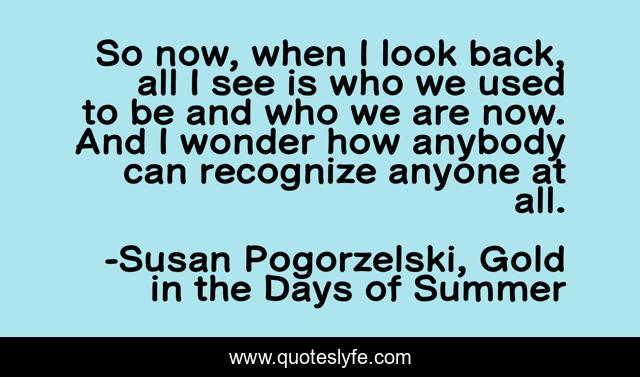 This page presents the quote "So now, when I look back, all I see is who we used to be and who we are now. And I wonder how anybody can recognize anyone at all.". Author of this quote is Susan Pogorzelski, Gold in the Days of Summer. This quote is about reflective, change, identity,.