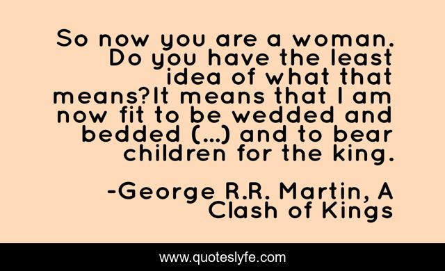 This page presents the quote "So now you are a woman. Do you have the least idea of what that means?It means that I am now fit to be wedded and bedded (...) and to bear children for the king.". Author of this quote is George R.R. Martin, A Clash of Kings. This quote is about patriarchy, queens, women-s-rights, feminism, women,.