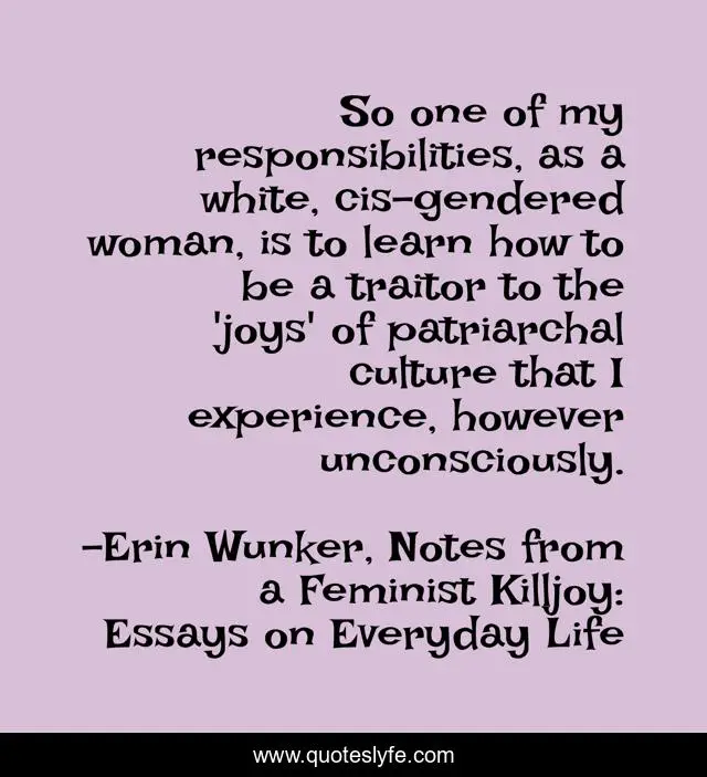 This page presents the quote "So one of my responsibilities, as a white, cis-gendered woman, is to learn how to be a traitor to the 'joys' of patriarchal culture that I experience, however unconsciously.". Author of this quote is Erin Wunker, Notes from a Feminist Killjoy: Essays on Everyday Life. This quote is about intersectional-feminism, feminism,.