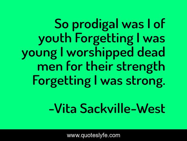 This page presents the quote "So prodigal was I of youth Forgetting I was young I worshipped dead men for their strength Forgetting I was strong.". Author of this quote is Vita Sackville-West. This quote is about self, acceptance,.