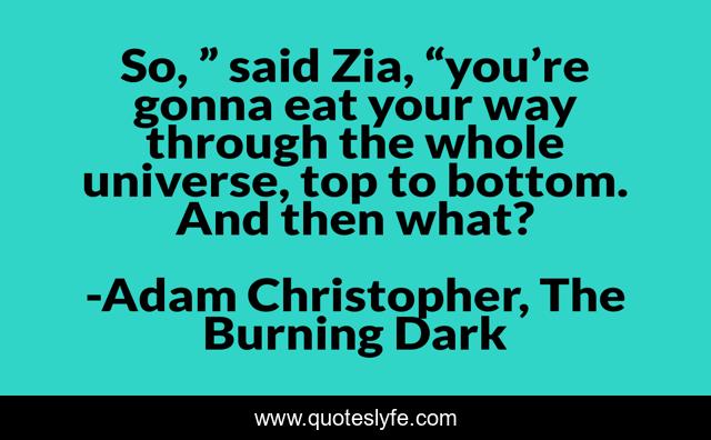 This page presents the quote "So, ” said Zia, “you’re gonna eat your way through the whole universe, top to bottom. And then what?". Author of this quote is Adam Christopher, The Burning Dark. .