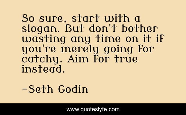This page presents the quote "So sure, start with a slogan. But don't bother wasting any time on it if you're merely going for catchy. Aim for true instead.". Author of this quote is Seth Godin. This quote is about branding, slogans, truth,.