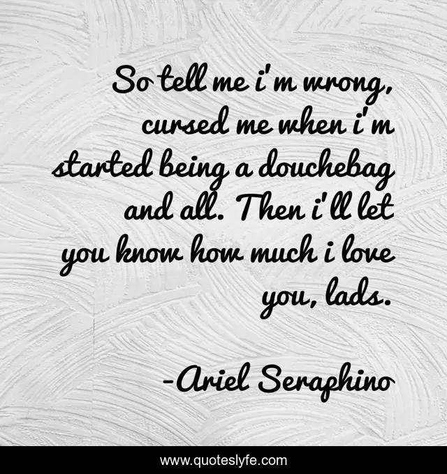 This page presents the quote "So tell me i'm wrong, cursed me when i'm started being a douchebag and all. Then i'll let you know how much i love you, lads.". Author of this quote is Ariel Seraphino. This quote is about thankfulness, friendship, mistakes, love, affection,.
