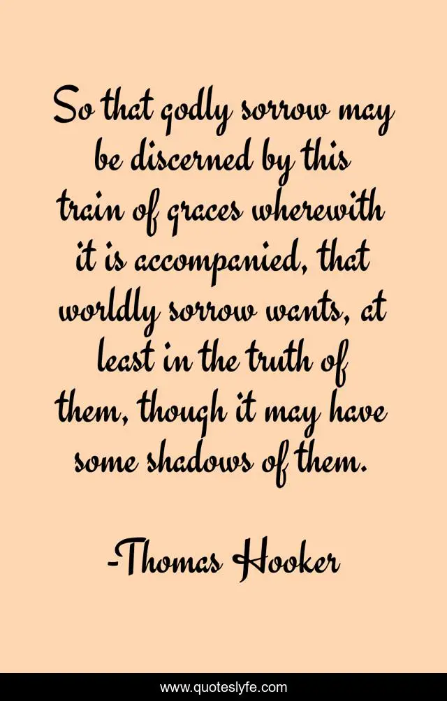 This page presents the quote "So that godly sorrow may be discerned by this train of graces wherewith it is accompanied, that worldly sorrow wants, at least in the truth of them, though it may have some shadows of them.". Author of this quote is Thomas Hooker. This quote is about shadows, sorrow, train,.
