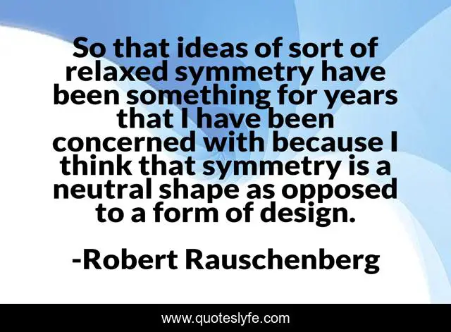 This page presents the quote "So that ideas of sort of relaxed symmetry have been something for years that I have been concerned with because I think that symmetry is a neutral shape as opposed to a form of design.". Author of this quote is Robert Rauschenberg. This quote is about shape, ideas, think,.