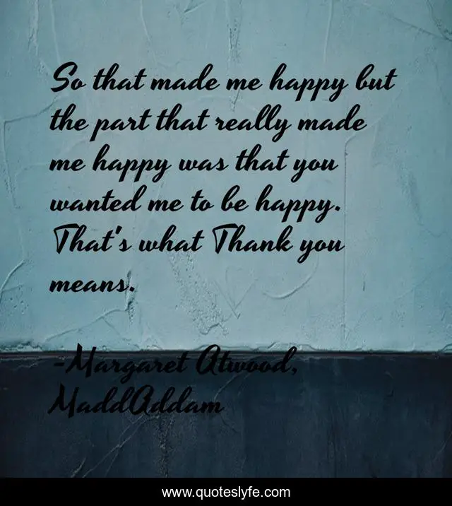 This page presents the quote "So that made me happy but the part that really made me happy was that you wanted me to be happy. That's what Thank you means.". Author of this quote is Margaret Atwood, MaddAddam. This quote is about empathy, meanings, thanks, happiness,.