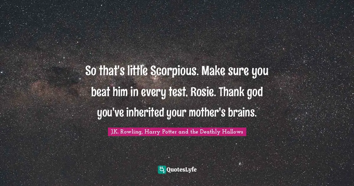 This page presents the quote "So that's little Scorpious. Make sure you beat him in every test, Rosie. Thank god you've inherited your mother's brains.". Author of this quote is J.K. Rowling, Harry Potter and the Deathly Hallows. This quote is about hermione-granger, ron-weasley, humor, malfoy,.