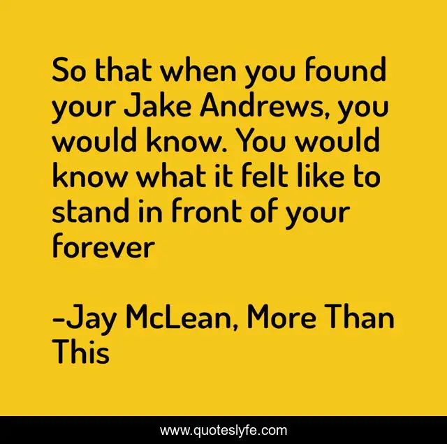 This page presents the quote "So that when you found your Jake Andrews, you would know. You would know what it felt like to stand in front of your forever". Author of this quote is Jay McLean, More Than This. This quote is about finding, forever,.