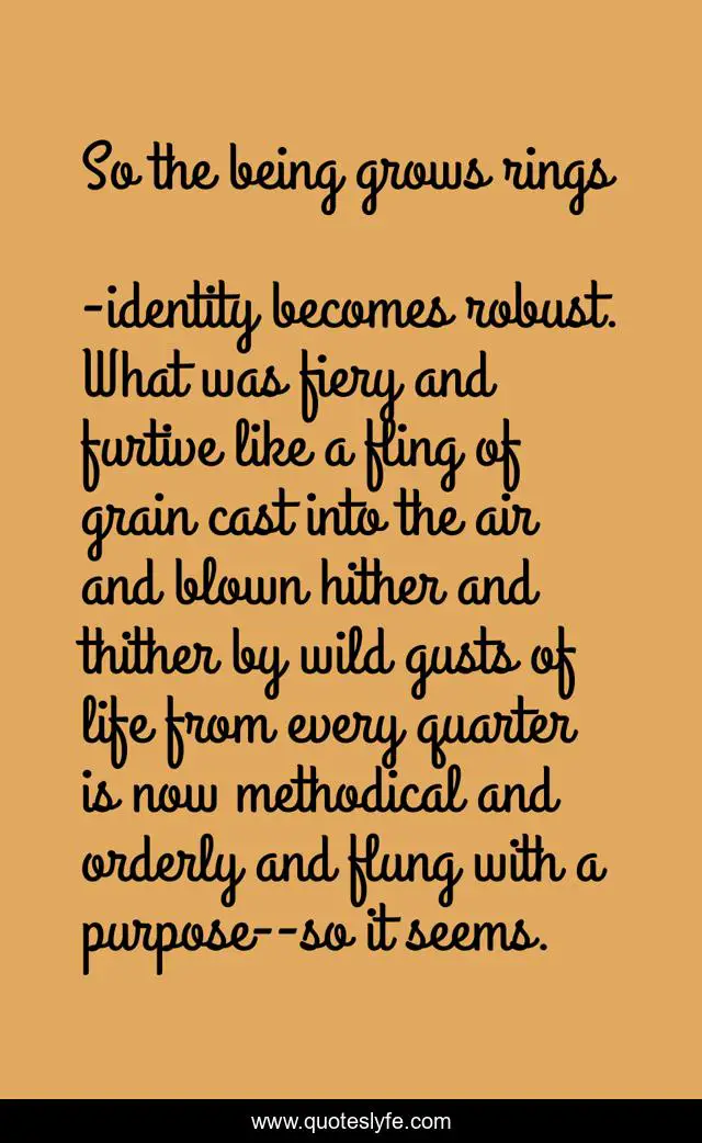 "identity becomes robust. What was fiery and furtive like a fling of grain cast into the air and blown hither and thither by wild gusts of life from every quarter is now methodical and orderly and flung with a purpose--so it seems. Quotes." Quoteslyfe.com, 2025. Mon. 08 Dec. 2025. <https://www.quoteslyfe.com/quote/So-the-being-grows-rings-171241>.