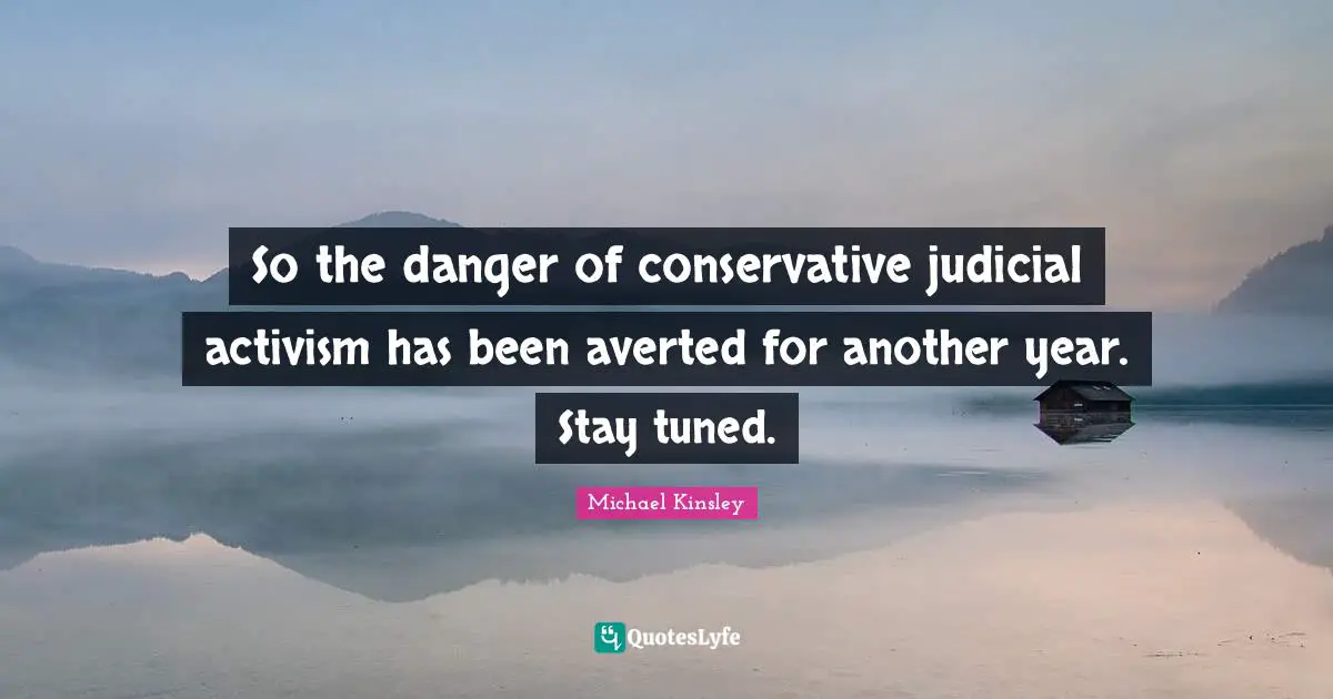 This page presents the quote "So the danger of conservative judicial activism has been averted for another year. Stay tuned.". Author of this quote is Michael Kinsley. This quote is about danger, another year, activism, conservative, judicial, years,.