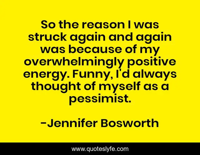 This page presents the quote "So the reason I was struck again and again was because of my overwhelmingly positive energy. Funny, I'd always thought of myself as a pessimist.". Author of this quote is Jennifer Bosworth. This quote is about electrical-charges, funny, sarcasm, energy, lightning, struck, comedy, irony,.