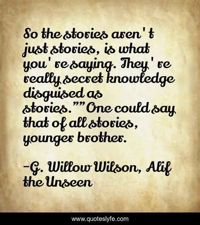 This page presents the quote "So the stories aren't just stories, is what you're saying. They're really secret knowledge disguised as stories.""One could say that of all stories, younger brother.". Author of this quote is G. Willow Wilson, Alif the Unseen. This quote is about books, stories, knowledge, learning, reading,.