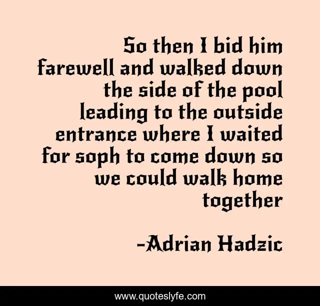 This page presents the quote "So then I bid him farewell and walked down the side of the pool leading to the outside entrance where I waited for soph to come down so we could walk home together". Author of this quote is Adrian Hadzic. This quote is about sadness, heartbreak, helplessness,.