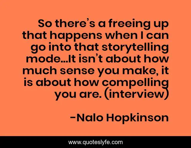 This page presents the quote "So there’s a freeing up that happens when I can go into that storytelling mode...It isn’t about how much sense you make, it is about how compelling you are. (interview)". Author of this quote is Nalo Hopkinson. This quote is about storytelling, writing,.