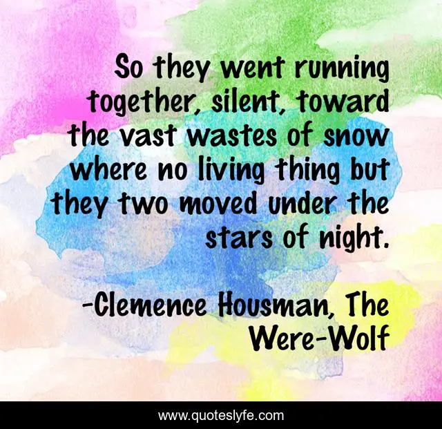 This page presents the quote "So they went running together, silent, toward the vast wastes of snow where no living thing but they two moved under the stars of night.". Author of this quote is Clemence Housman, The Were-Wolf. This quote is about running, cold, night, winter, snow,.