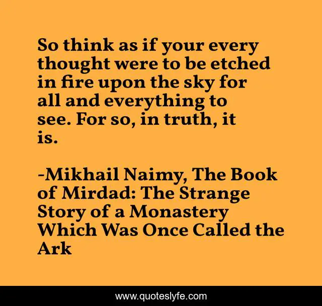 This page presents the quote "So think as if your every thought were to be etched in fire upon the sky for all and everything to see. For so, in truth, it is.". Author of this quote is Mikhail Naimy, The Book of Mirdad: The Strange Story of a Monastery Which Was Once Called the Ark. This quote is about thought, spirit,.