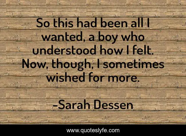This page presents the quote "So this had been all I wanted, a boy who understood how I felt. Now, though, I sometimes wished for more.". Author of this quote is Sarah Dessen. This quote is about relationships, dream, love, affection, wants,.