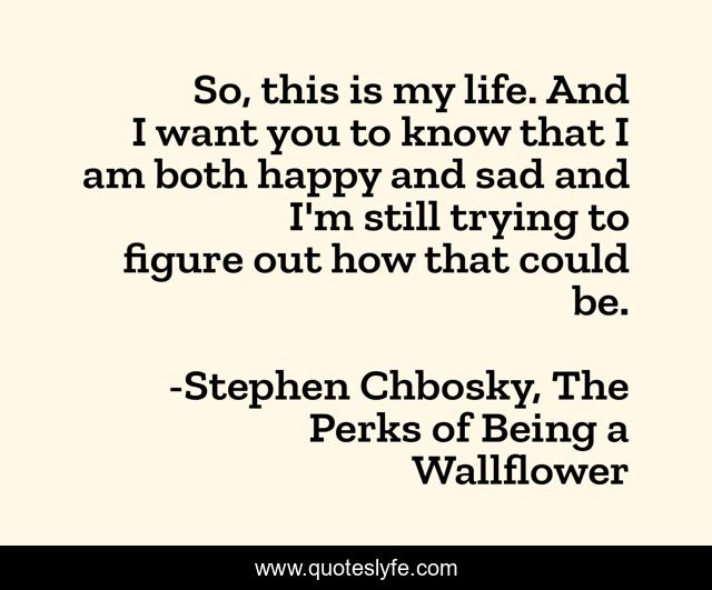 This page presents the quote "So, this is my life. And I want you to know that I am both happy and sad and I'm still trying to figure out how that could be.". Author of this quote is Stephen Chbosky, The Perks of Being a Wallflower. This quote is about favourite-books, charlie, soul-searching, sad, wallflower, inspirational, enthusiasm,.