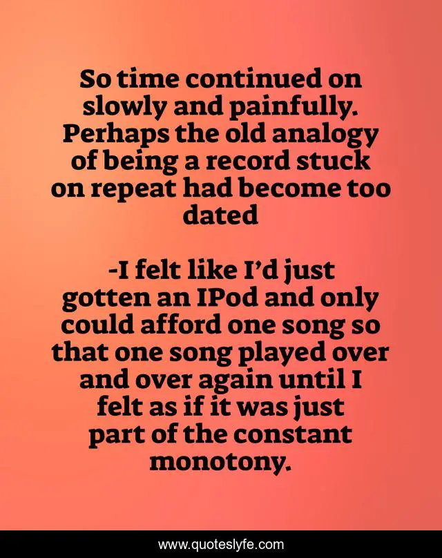 This page presents the quote "So time continued on slowly and painfully. Perhaps the old analogy of being a record stuck on repeat had become too dated". Author of this quote is I felt like I’d just gotten an IPod and only could afford one song so that one song played over and over again until I felt as if it was just part of the constant monotony.. .