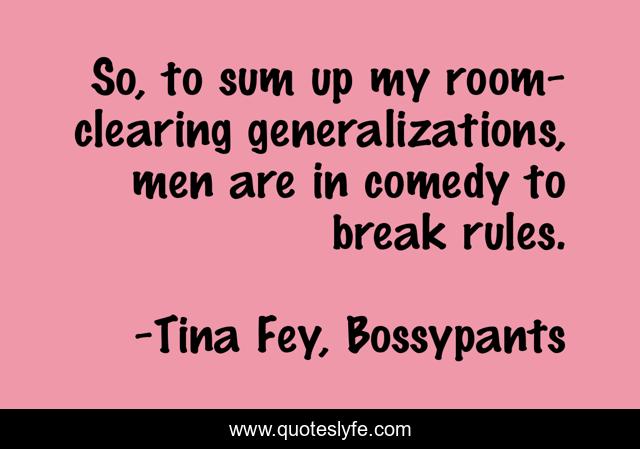 This page presents the quote "So, to sum up my room-clearing generalizations, men are in comedy to break rules.". Author of this quote is Tina Fey, Bossypants. This quote is about rules, comedy, male,.