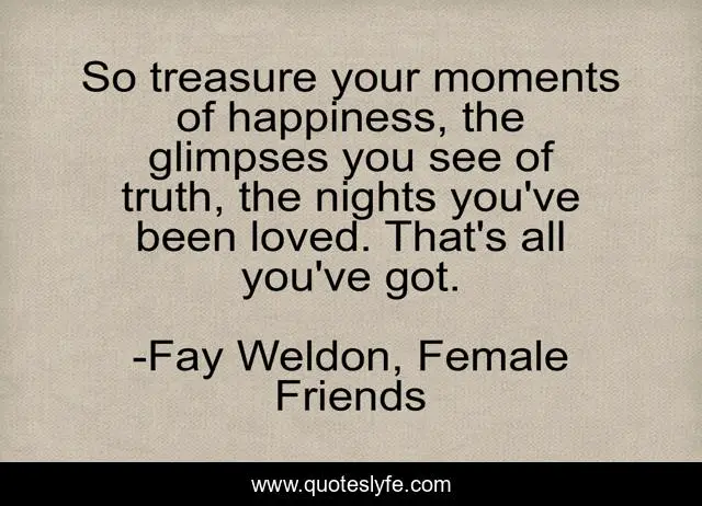 "Fay Weldon, Female Friends Quotes." Quoteslyfe.com, 2025. Sun. 07 Dec. 2025. <https://www.quoteslyfe.com/quote/So-treasure-your-moments-of-happiness-the-17571>.