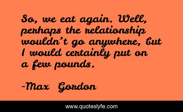 This page presents the quote "So, we eat again. Well, perhaps the relationship wouldn’t go anywhere, but I would certainly put on a few pounds.". Author of this quote is Max Gordon. This quote is about mystery, mystery-novel, kit-mccormick,.