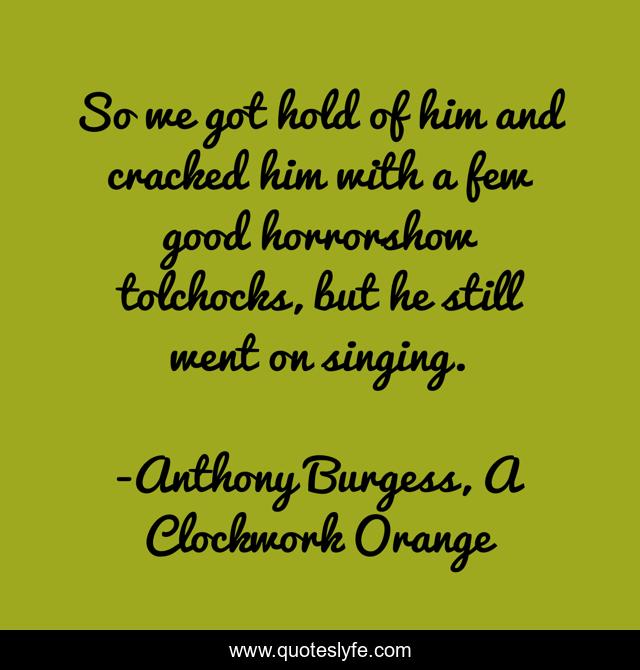 This page presents the quote "So we got hold of him and cracked him with a few good horrorshow tolchocks, but he still went on singing.". Author of this quote is Anthony Burgess, A Clockwork Orange. .