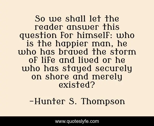 This page presents the quote "So we shall let the reader answer this question for himself: who is the happier man, he who has braved the storm of life and lived or he who has stayed securely on shore and merely existed?". Author of this quote is Hunter S. Thompson. This quote is about gonzo, risk, happiness,.