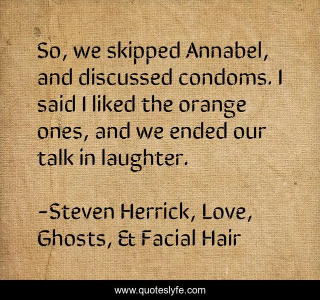 "Steven Herrick, Love, Ghosts, & Facial Hair Quotes." Quoteslyfe.com, 2025. Fri. 05 Dec. 2025. <https://www.quoteslyfe.com/quote/So-we-skipped-Annabel-and-discussed-condoms-164341>.