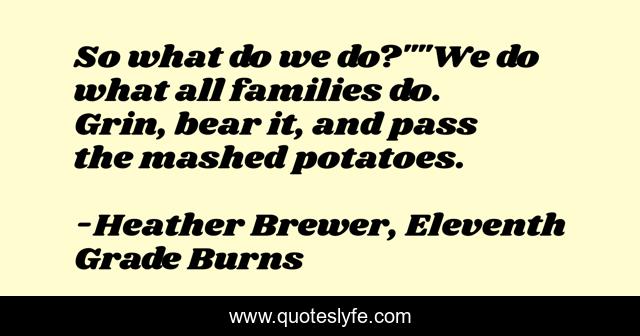 This page presents the quote "So what do we do?""We do what all families do. Grin, bear it, and pass the mashed potatoes.". Author of this quote is Heather Brewer, Eleventh Grade Burns. This quote is about thanksgiving, family, vampires,.