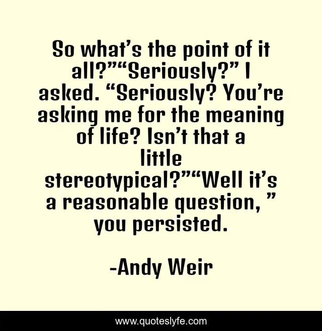 This page presents the quote "So what’s the point of it all?”“Seriously?” I asked. “Seriously? You’re asking me for the meaning of life? Isn’t that a little stereotypical?”“Well it’s a reasonable question, ” you persisted.". Author of this quote is Andy Weir. This quote is about enthusiasm, spiritual, humor, inspirational,.