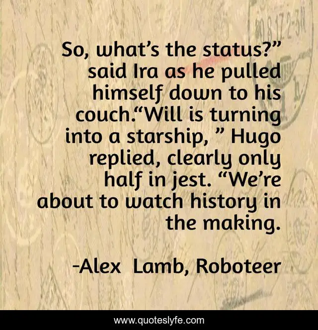 This page presents the quote "So, what’s the status?” said Ira as he pulled himself down to his couch.“Will is turning into a starship, ” Hugo replied, clearly only half in jest. “We’re about to watch history in the making.". Author of this quote is Alex Lamb, Roboteer. This quote is about starship, history,.