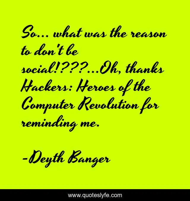 This page presents the quote "So... what was the reason to don't be social!???...Oh, thanks Hackers: Heroes of the Computer Revolution for reminding me.". Author of this quote is Deyth Banger. This quote is about don-t, reason, social, to,.